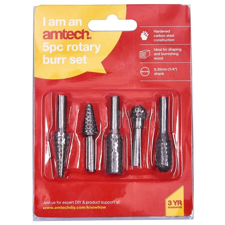 DURABLE: These rotary burrs are made from strong, hardened carbon steel for durability. IDEAL FOR WOODWORKERS: They are ideal for grinding, polishing, shaping and burnishing wood surfaces. VERSATILE: With a 6mm (1/4″) shank, the set includes five popular shapes: ball, oval, cylinder, large and small cone.