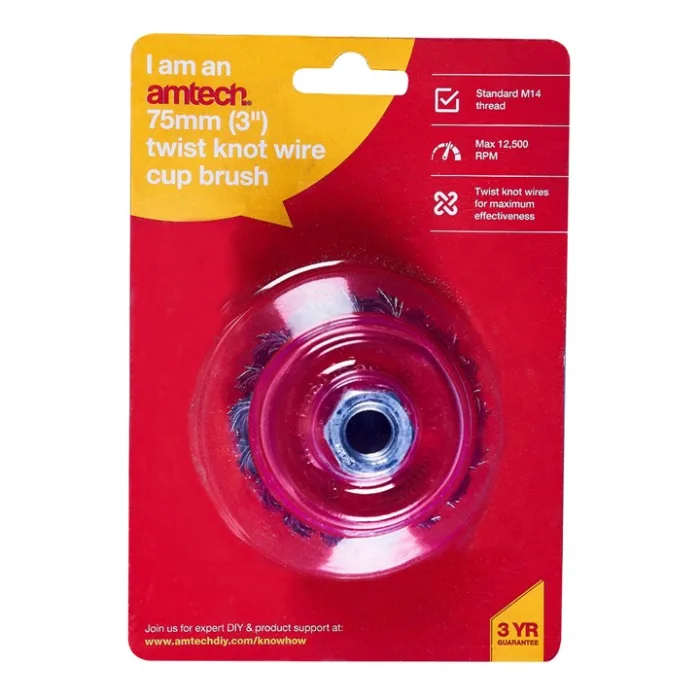 TOUGH CLEANING: This 80mm (3″) twist knot wire cup brush has wires twisted into tight spirals to maximise the abrasive action. 12,500 RPM: With an M14 x 2 arbor, it operates a maximum 12,500 RPM.