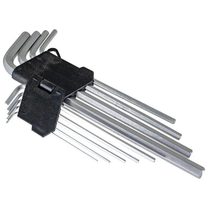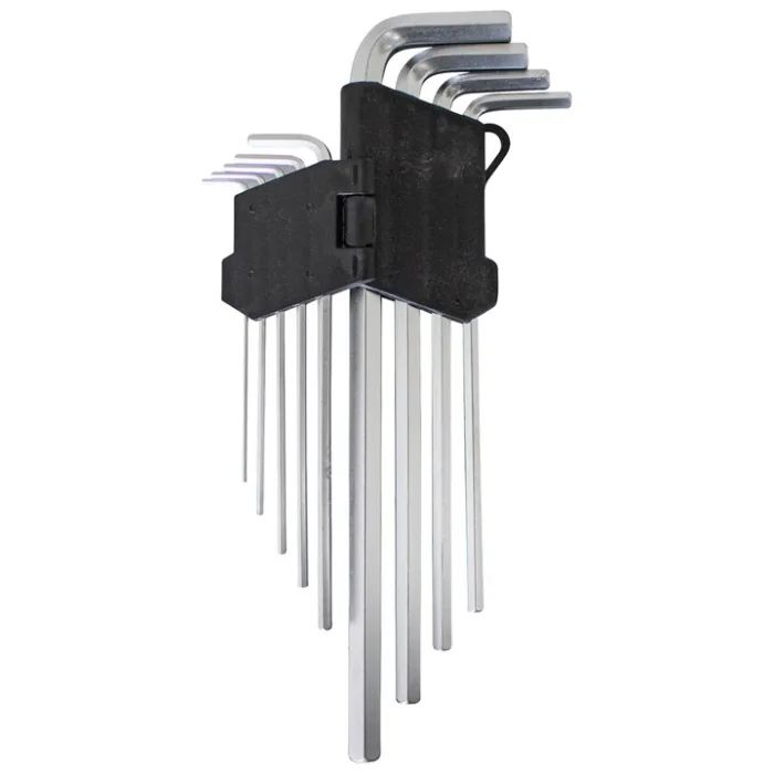 DURABLE: This 9 piece hex key set is made from chrome vanadium steel for strength and durability and comes with a plastic storage holder. EXTRA-LONG: Extra long for increased leverage, the set includes hex key sizes: 1.5mm, 2m, 2.5mm, 3mm, 3.5mm, 4mm, 5mm, 6mm, 8mm and 10mm.