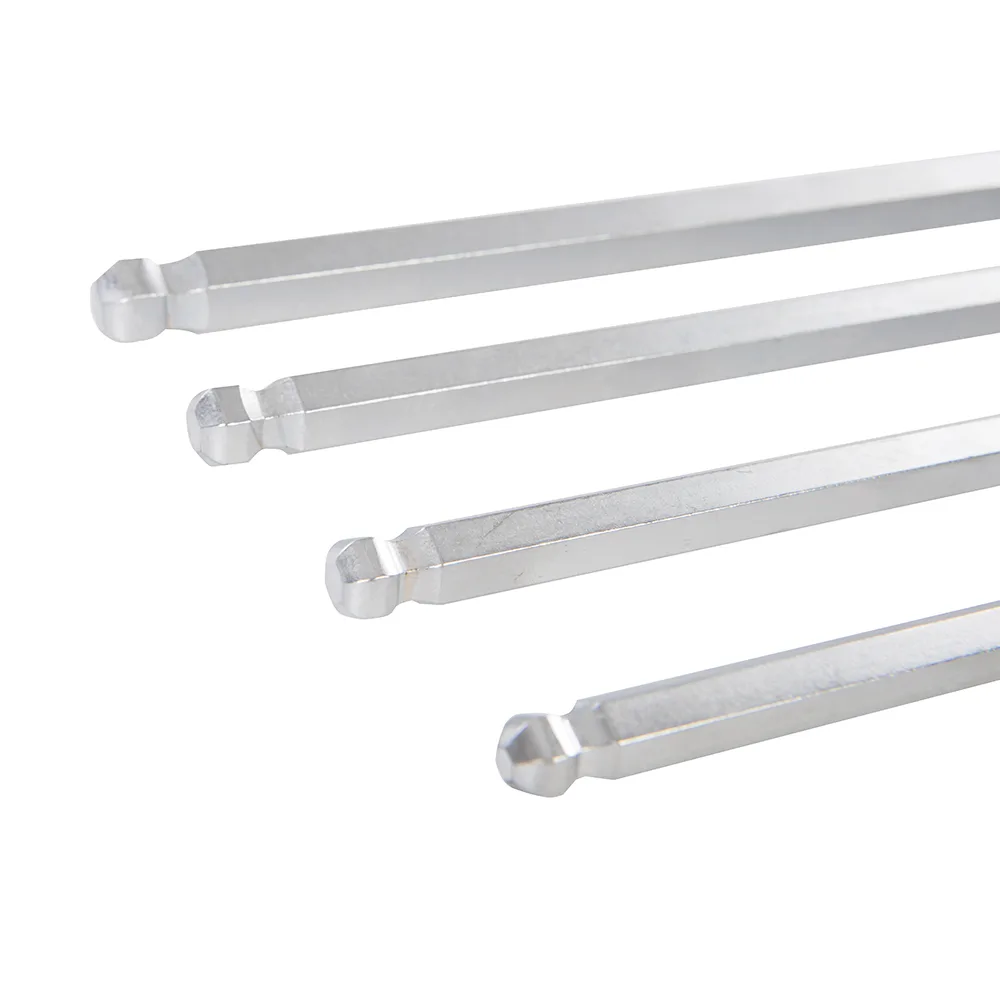 Chrome vanadium with satin finish. Extra-long ball end metric hex keys. Sizes: 3, 4, 5, 6, 7, 8, 10, 12, 14 and 17mm. 25° off-centre access turning.