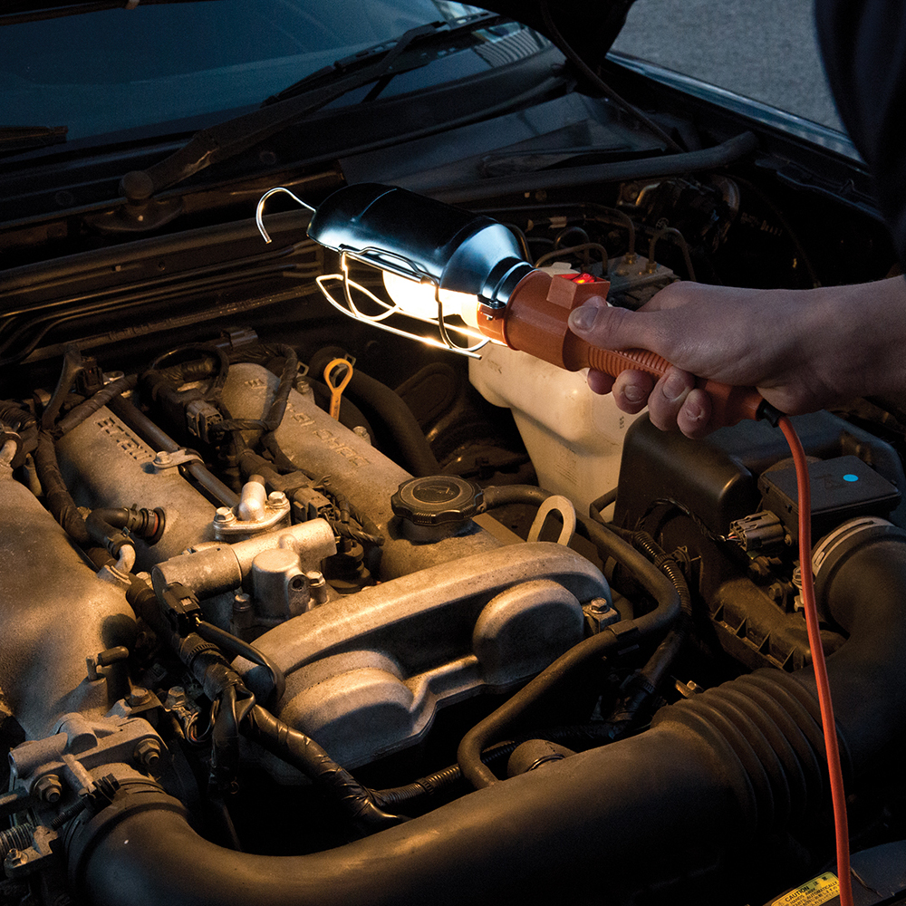Portable mains work light. Protective cage around lamp. Handy hanging hook for overhead illumination. CE approved. IP20 rated. Overall length 400mm. Cable 5m. Requires ES screw-fitting bulb 60W.